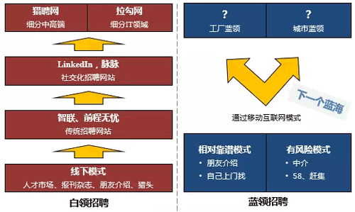 通過分析整個(gè)招聘行業(yè),我們看到白領(lǐng)招聘已經(jīng)互聯(lián)網(wǎng)化并進(jìn)入細(xì)分競爭階段。由于智能手機(jī)的普及,藍(lán)領(lǐng)招聘剛剛進(jìn)入移動互聯(lián)網(wǎng)化的窗口期,尚未有成型的玩家出現(xiàn)。信息源:揭陽人才網(wǎng)_www.ljlh6688.com